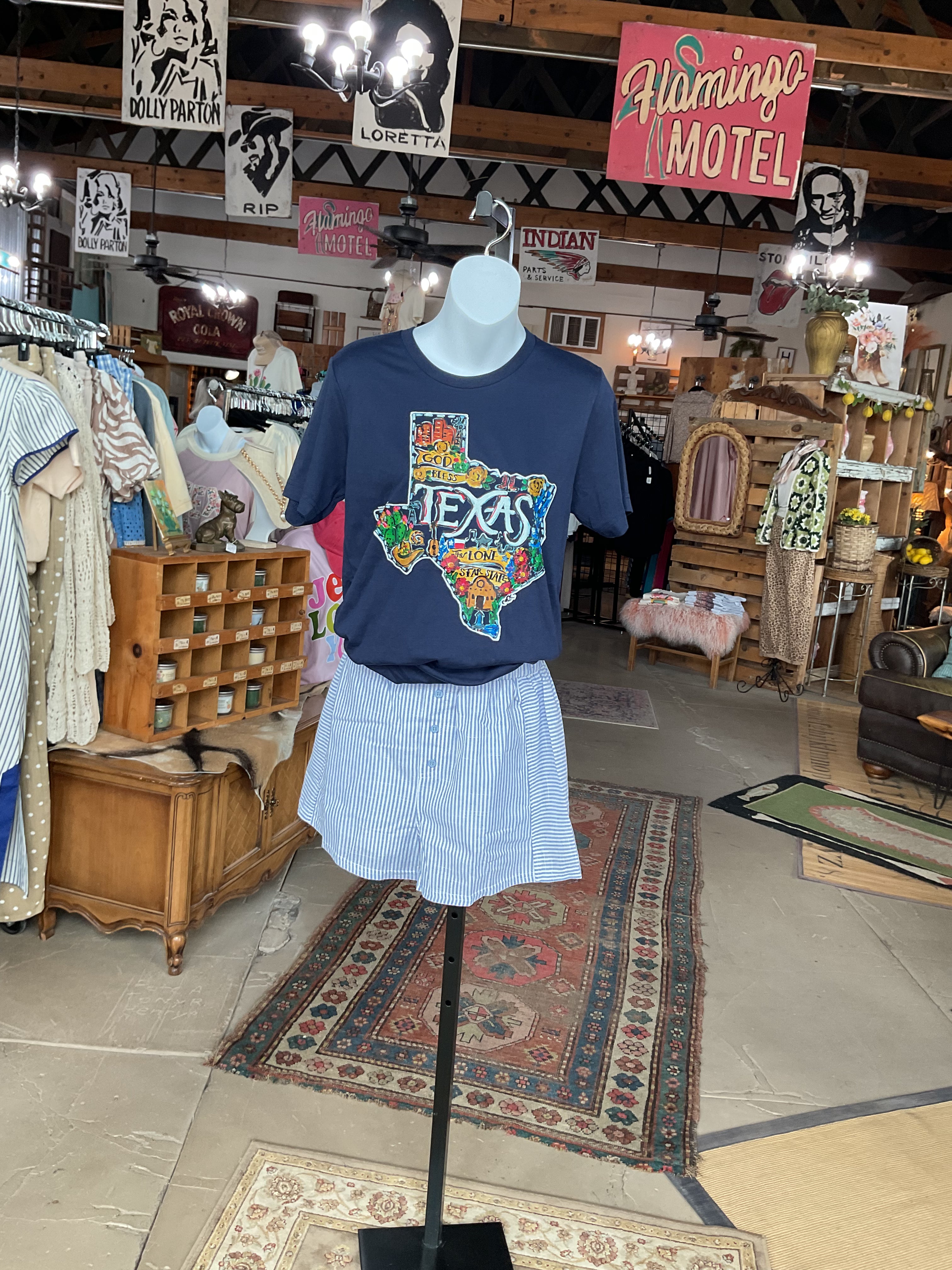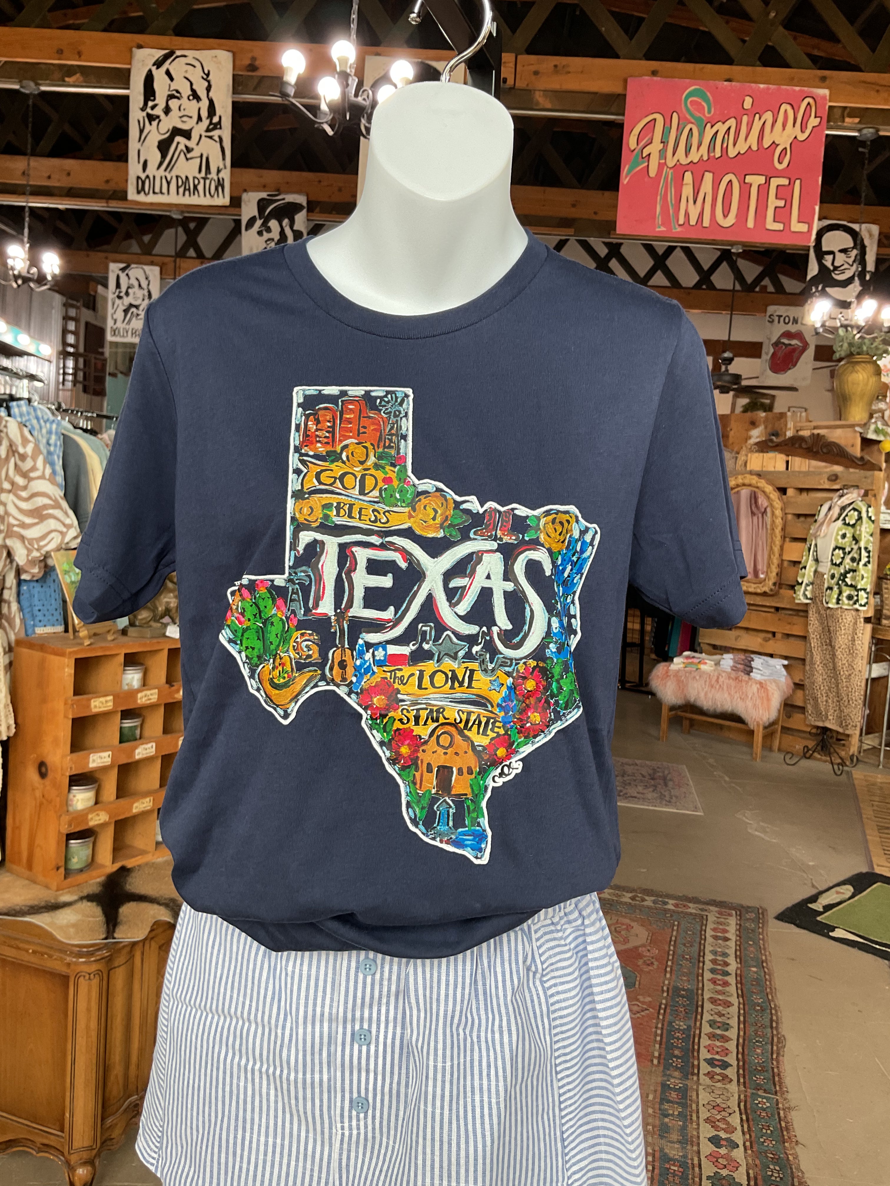 Show off your Texas pride with a tee that is as bold and spirited as the state itself. This classic navy top features a high-character graphic of the Texas border, intricately filled with colorful wildflowers, acoustic guitars, and "God Bless Texas" script. The detailed, multi-tonal print gives it a "funky" artisanal feel, perfect for those who love a curated, soulful look.