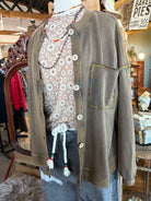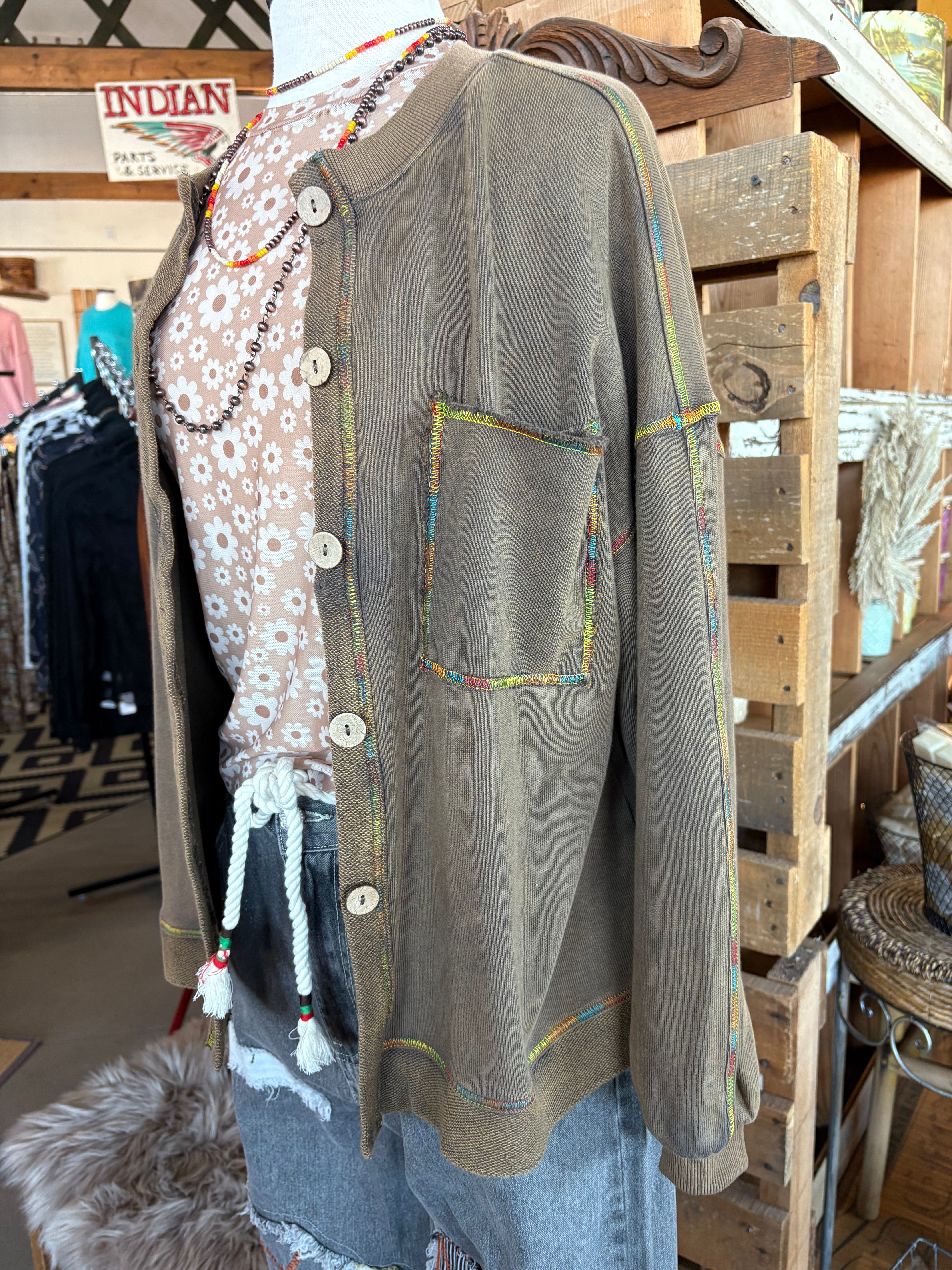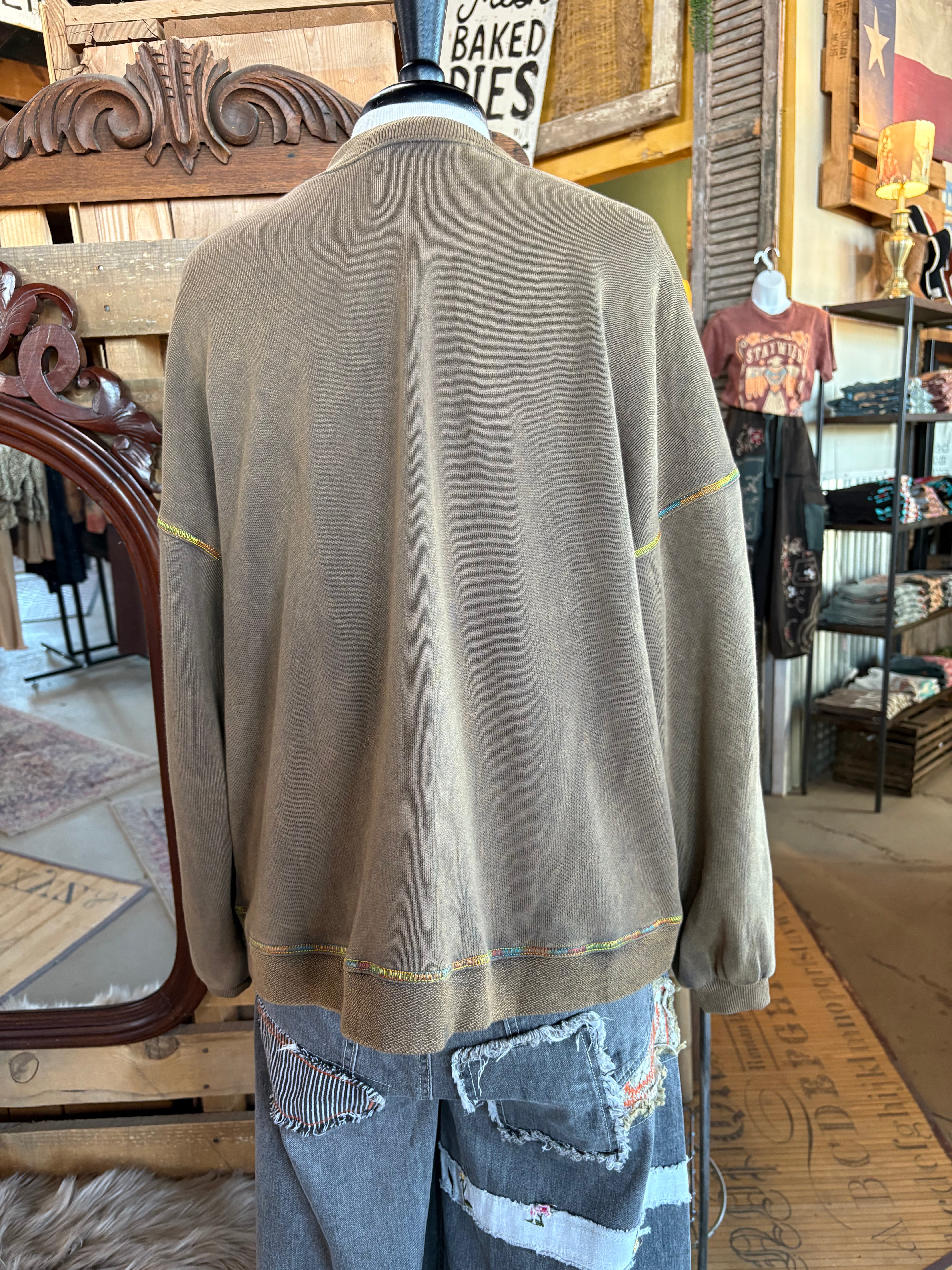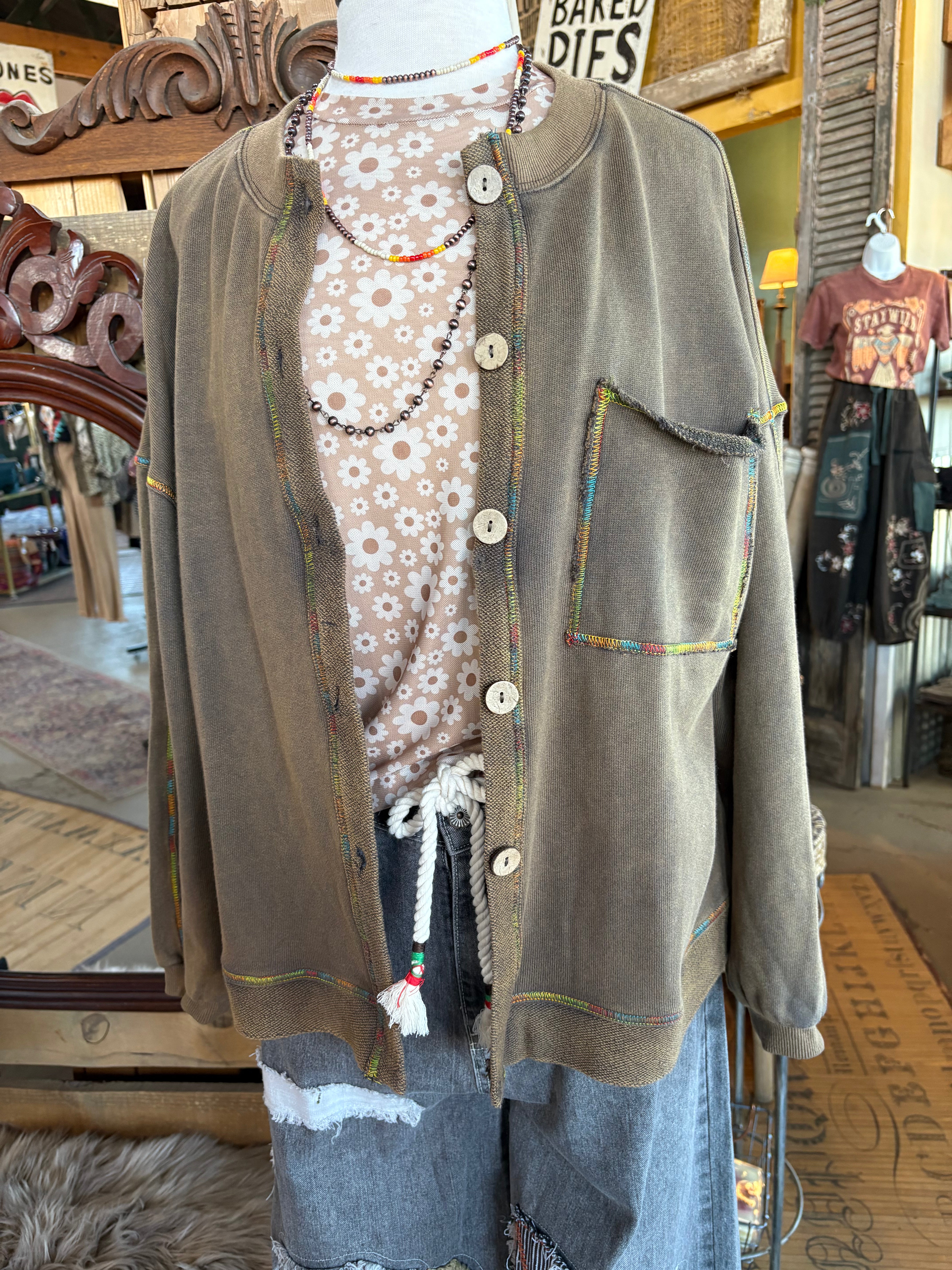 Add a pop of happy color to your layering game with this Golden Kiwi cardigan — the perfect mix of earthy and fun. The vintage-washed finish gives it that lived-in, boutique feel, while the rainbow stitching adds just the right dose of personality. It’s comfy, relaxed, and pairs effortlessly with mesh tops, tees, or button-downs all year long.