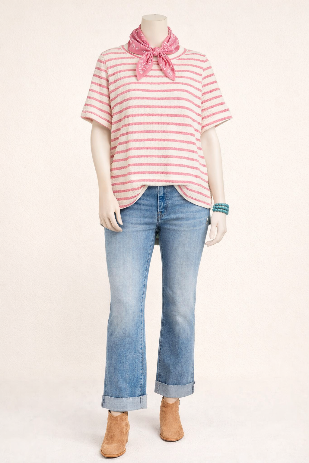 This soft striped tee features a textured knit fabric with a flattering hi-low hem and side slits for easy movement. It’s the perfect everyday boutique top that pairs beautifully with denim, skirts, and wild rags.