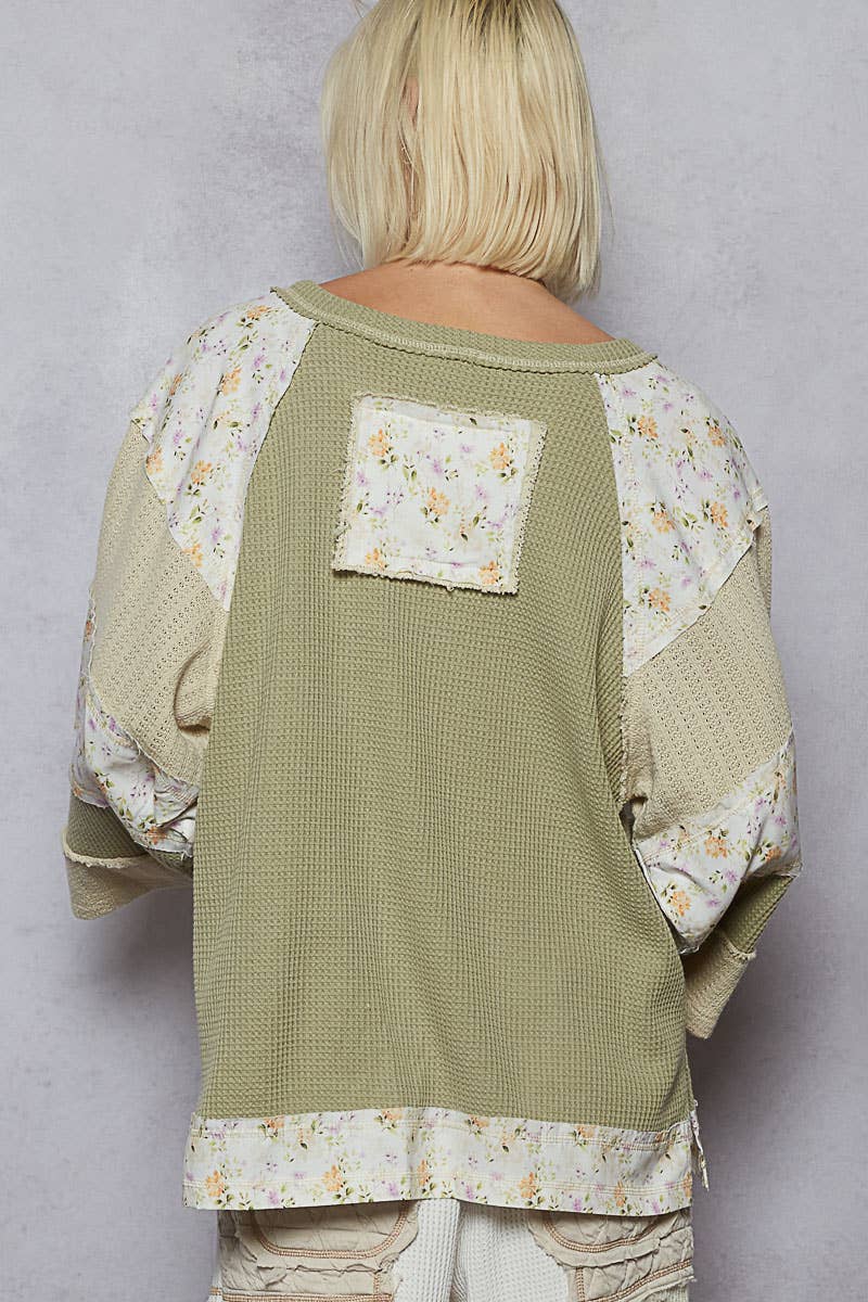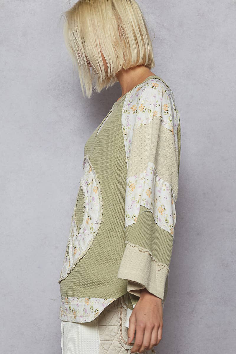Designed in round neck three quarter sleeve roomy fit top in thermal with print peace patch, overlock stitch point, cut and sew knit sweater patch, side open slit, vintage washing, solid color. Charcoal, Powder blue: Patch (print) placement might change each sample. Specs/Dimensions: - BUST: 24-1/4" - LENGTH: 28" - SLEEVE LENGTH: 23-1/2"