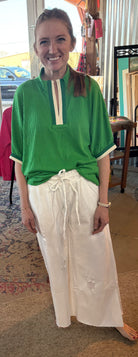Short dolman sleeves with matching contrast cuffs add the perfect finishing touch. Pair it with denim, white wide legs, or linen pants for a fresh spring look.