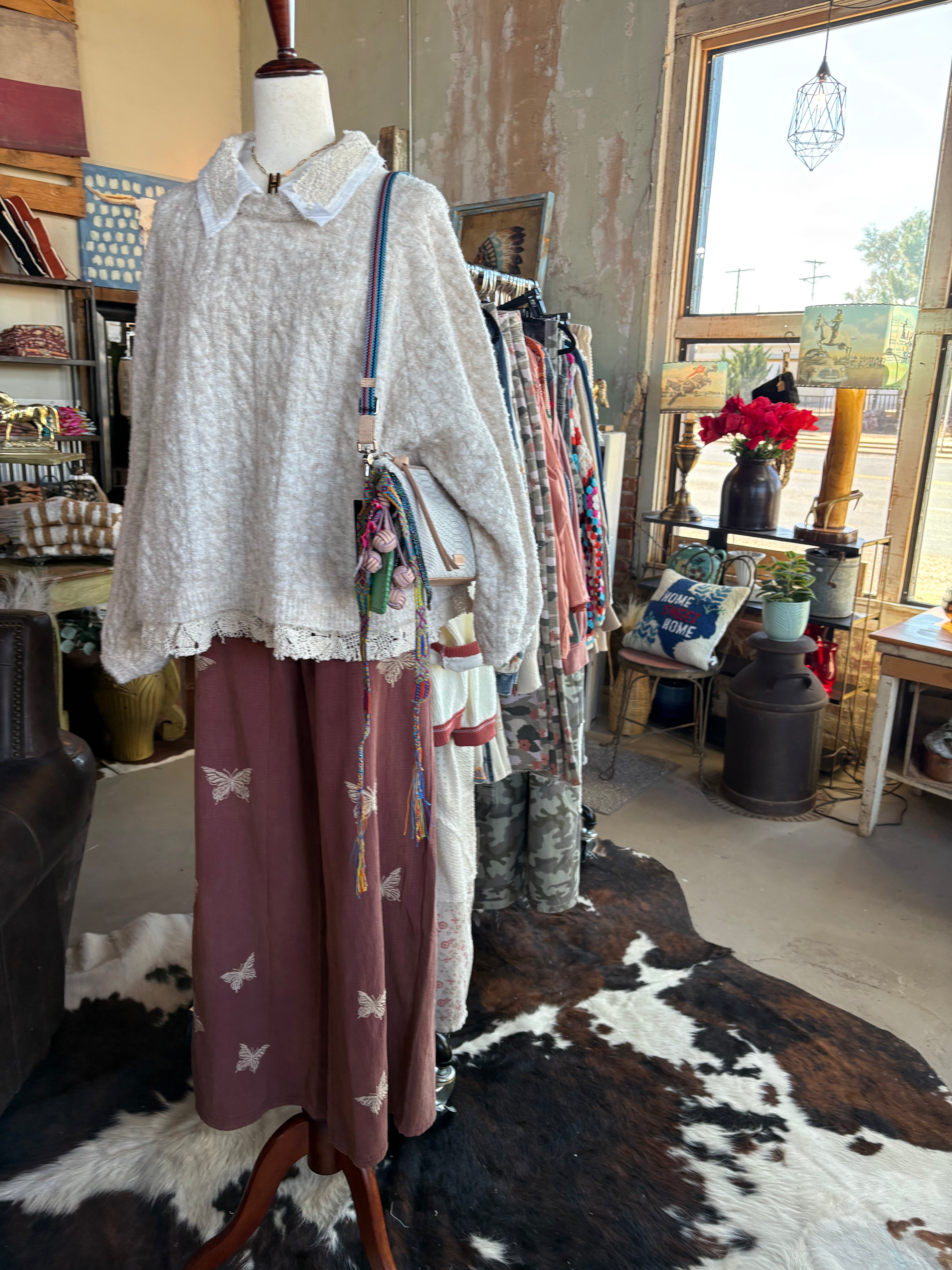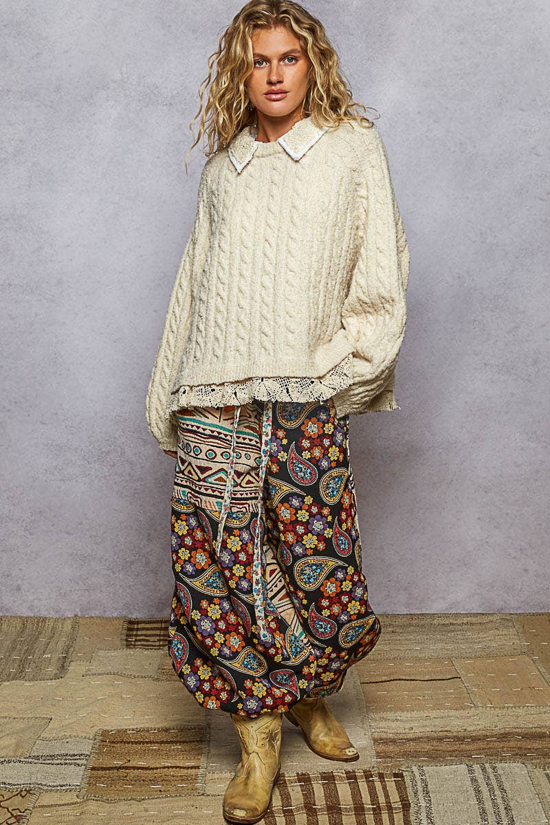 Cozy meets charming in this relaxed-fit sweater featuring a soft acrylic knit body and a double gauze crochet collar. Balloon sleeves and crochet trim at the hem add the sweetest boho details. Perfect for layering with skirts or wide-leg pants for an effortlessly feminine fall look.